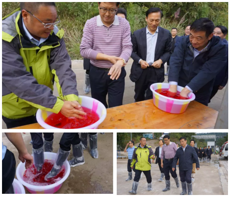 巴山牧業董事長張育賢先生詳細介紹非洲豬瘟期間我司的防控措施,一次性參觀鞋套,消毒水浸泡水、腳等,并嚴格消毒三分鐘。進入園區參觀。