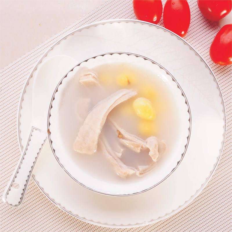 1.豬肚條,飛水,切8cm、鮮白果飛水備用,姜拍破,蔥挽結,胡椒拍破備用。